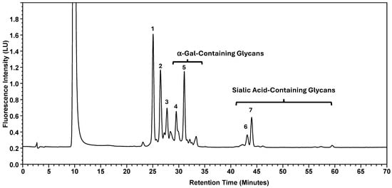 Observations indicated that the Sep-PAK HILIC cartridge resulted in reduced recovery of overall glycans (Peaks 1–7), as judged by the peak heights in chromatograms, and exhibited considerable variability in terms of percent peak areas (Figure 3). This outcome is likely attributable to the legacy elution protocol employing 20% acetonitrile. For improved recovery, particularly with sialic acid-containing glycans, a gentler basic aqueous solution, such as 100 mM ammonium acetate in 5% acetonitrile, may be applied to efficiently elute highly retained glycans from the HILIC cartridge [31]. Nonetheless, Sep-PAK HILIC cartridge is not suitable for this legacy method using standardized procedures.