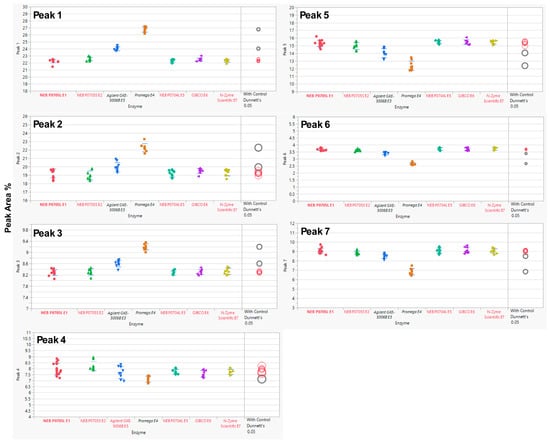 Dunnett’s Comparison of PNGase F Between the Control Enzyme (New England Biolabs P0705L, E1) and Other Enzymes (E2–E7). Means for each enzyme were compared to the control (E1) using ANOVA with Dunnett’s test. Statistically significant differences from the control enzyme (E1, bold red) are shown in black (enzyme labels and circles). Red indicates no significant difference from the control. The circle size reflects the standard deviation of measurements. The y-axis represents the % Peak Area, which is the relative abundance of each peak in relation to the total integrated peaks from 20 to 65 min.