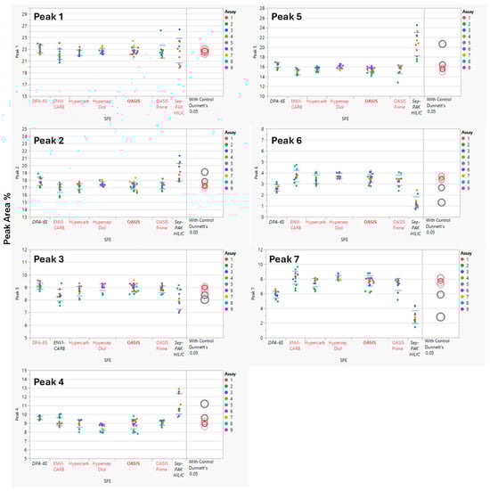 Among the seven solid-phase extraction cartridges evaluated, Sep-PAK HILIC and Discovery DPA-6S differed significantly from the OASIS cartridge. HyperSep DIOL, Hypercarb, and OASIS PRiME performed similarly to OASIS, while ENVI-CARB showed a difference only for Peak 3 (Figure 3).