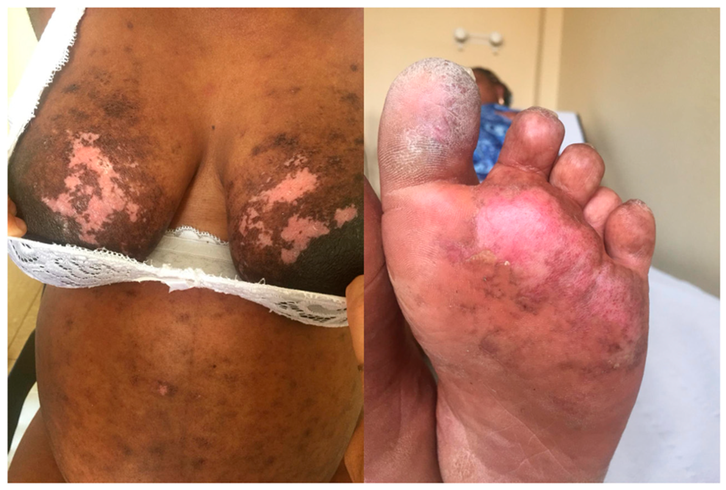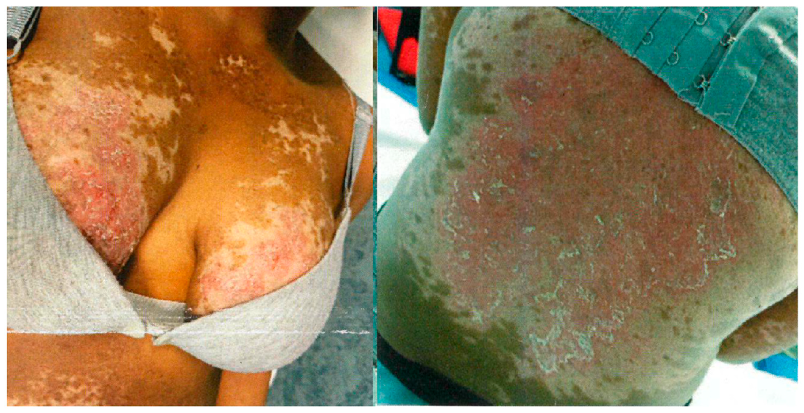 CYA was discontinued and both intravenous BEL at a dose of 10 mg/kg/month, and MMF at a dose of 2 g/day were reintroduced. At the time of MMF reinitiation, an intrauterine device (IUD) was placed for contraceptive purposes. In 2020, however, cutaneous disease activity worsened again. Before modifying systemic immunosuppressive therapy, alternative treatment options were evaluated. Dapsone was excluded because of the patient’s glucose-6-phosphate dehydrogenase deficiency, and thalidomide was not considered suitable owing to poor adherence to contraceptive measures. Topical tacrolimus therapy was also deemed inappropriate by the dermatologist because of the extensive cutaneous involvement.