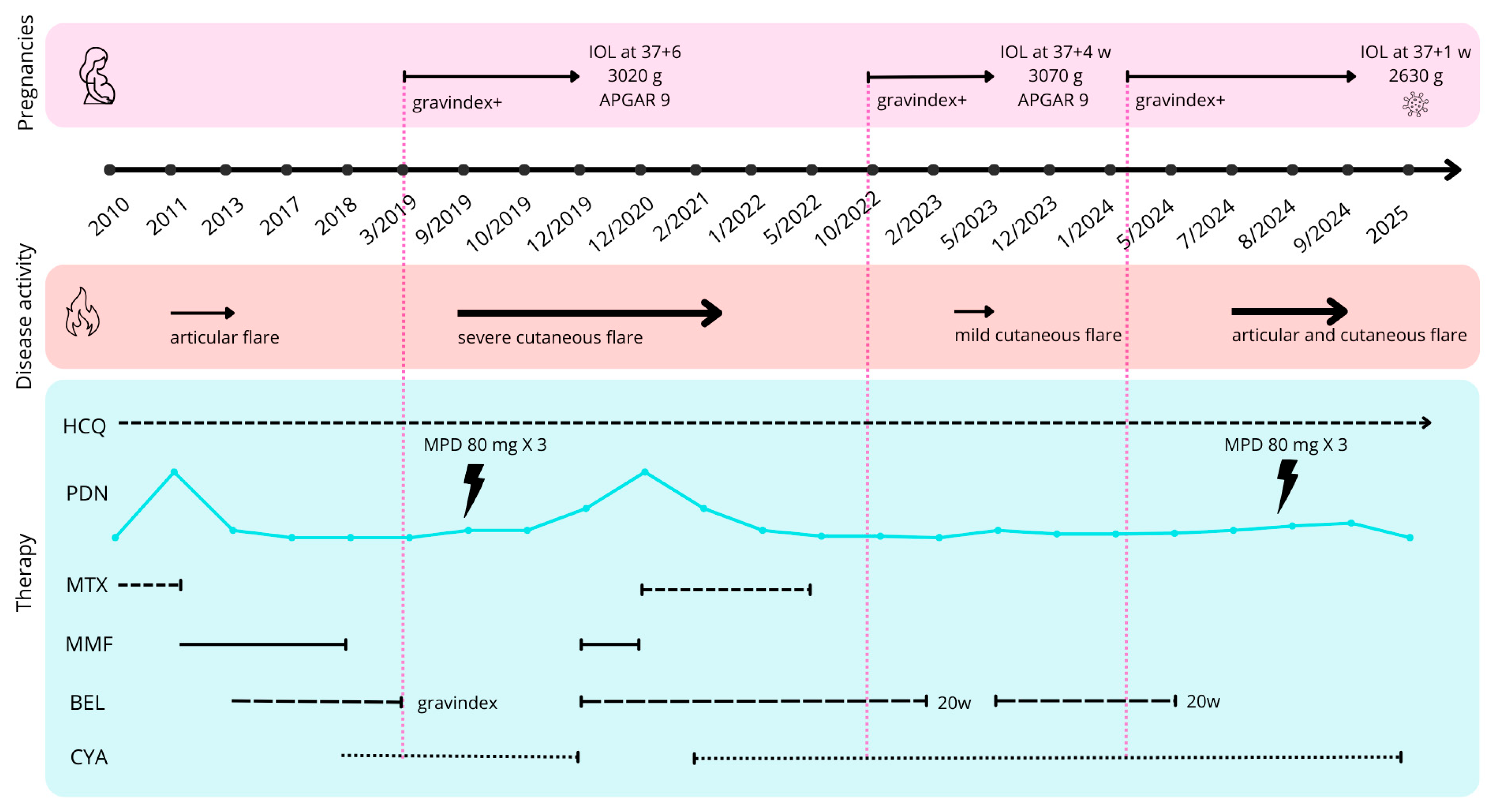 In March 2019, at the age of 32, the patient became pregnant. In accordance with the preconception plan and following shared decision-making process, BEL was discontinued at the time of pregnancy confirmation because of limited safety data during gestation. HCQ and low-dose PDN were continued, as well as vitamin D supplementation, and low-dose aspirin was initiated to reduce the risk of preeclampsia and placental-mediated complications. Folic acid was also started.