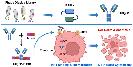 Using the previously established human scFv phage display library, several candidate clones with favorable binding activity to TfR1 were selected. The T8scFv identified in this study was further expressed in mammalian cells as a full-length IgG1 antibody, T8IgG1, which retained strong target-binding activity, demonstrating the feasibility and practicality of scFv as an initial screening scaffold. Flow cytometry analysis indicated that T8IgG1 specifically recognized TfR1 on tumor cell surfaces. Immunofluorescence microscopy further confirmed that the antibody could be efficiently internalized via TfR1-mediated endocytosis. T8IgG1 does not competitively bind Tf to TfR1; therefore, treatment of K562 cells with T8IgG1 alone does not disrupt iron metabolism or induce cell death. Moreover, T8IgG1 complexed with DT3C exhibited potent cytotoxic effects in K562 cells. Collectively, these results suggest that T8IgG1 holds potential as a delivery vehicle for antitumor drugs and other therapeutic biologics in future studies.