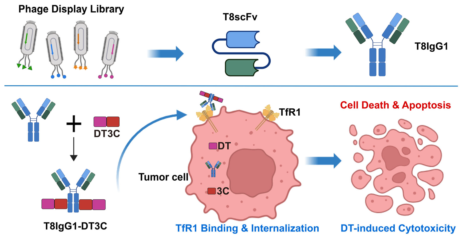 In this study, we developed the T8IgG1 antibody, which exhibits several distinct advantages over previous approaches: it binds TfR1 in a non-competitive manner, avoiding disruption of normal Tf-TfR1 interactions and thereby preserving cellular iron metabolism; it has moderate binding affinity (KD = 18.5 ± 0.1 nM) and efficiently undergoes TfR1-mediated internalization for transmembrane delivery; when conjugated to DT3C, it simulates ADC activity in vitro by releasing the DT3C catalytic domain to inhibit protein synthesis and induce tumor cell death, demonstrating superior targeting specificity and delivery efficiency. Compared with previously reported TfR1 antibodies, T8IgG1 combines efficient delivery, low systemic toxicity potential, and non-competitive binding, providing a novel and promising strategy for TfR1-targeted therapy.