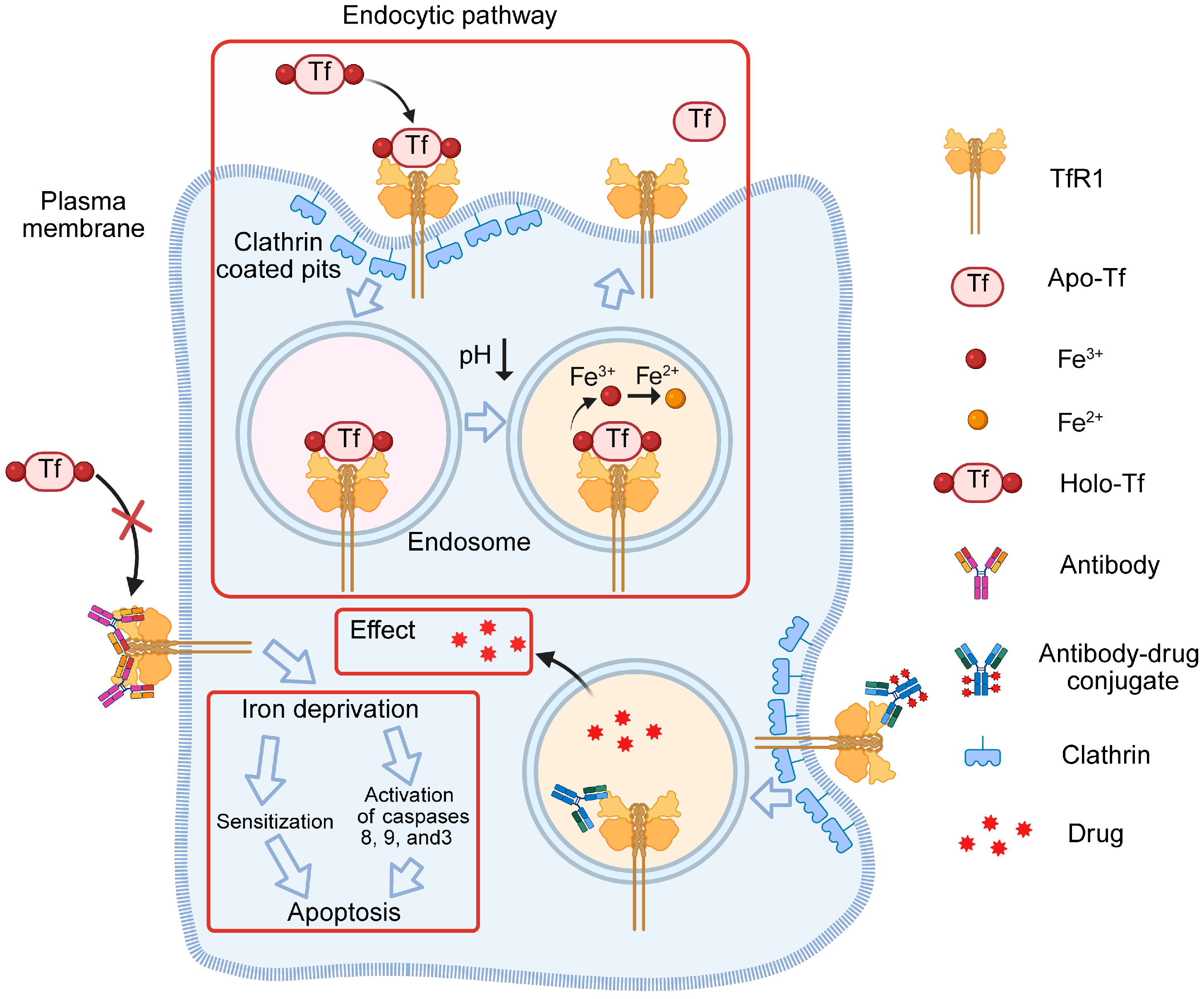 In recent years, TfR1 antibody-conjugate strategies, including antibody–drug conjugates (ADCs), have gained increasing attention, leveraging TfR1-mediated endocytosis to deliver cytotoxic agents directly into tumor cells, thereby enhancing targeted killing while minimizing systemic toxicity. For example, INA03, a humanized anti-CD71 antibody conjugated with Monomethyl Auristatin E, exhibited promising antitumor activity in acute leukemia models but has limitations: its efficacy is highly dependent on high CD71 expression, competitive binding with Tf may interfere with iron metabolism in normal cells, its tissue distribution and cytotoxic payload restrict its applicability, and long-term clinical safety and efficacy remain unverified [