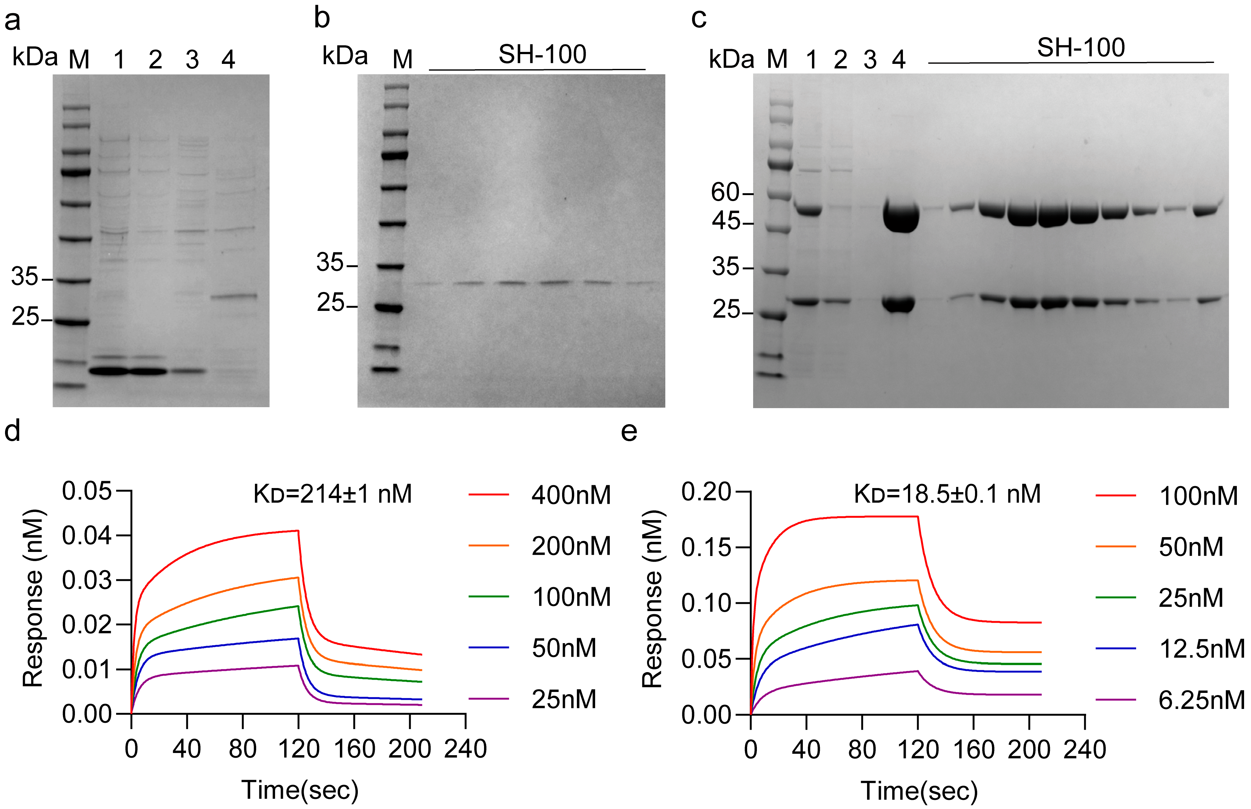 The scFv coding sequence was subcloned from the phagemid into the pRSF-Duet-1 expression vector, and a C-terminal His6 tag was incorporated to facilitate protein purification. To purify the scFv-His6 protein, single colonies of BL21 (DE3) harboring the expression plasmid were inoculated into 2YT liquid medium and incubated overnight at 37 °C with shaking at 250 rpm. The overnight culture was diluted 1:100 into 500 mL of fresh 2YT medium containing kanamycin (final concentration 50 µg/mL) and incubated at 37 °C, 220 rpm until the optical density at 600 nm (OD600) reached approximately 0.6. The culture was then allowed to stand briefly and rapidly cooled to 30 °C, followed by induction with isopropyl β-D-1-thiogalactopyranoside (IPTG) at a final concentration of 0.5 mM. After shaking at 30 °C, 200 rpm for 12 h, the bacterial cells were harvested. The cell pellet was resuspended in 100 mL of lysis buffer (100 mM Tris-HCl, pH 8.0; 0.7 M sucrose; 0.5 mM EDTA; 10 mg lysozyme) and incubated at 4 °C for 1 h. MgCl2 was then added to a final concentration of 5 mM, and the suspension was incubated for an additional 20 min. The lysate was centrifuged at 10,000 rpm for 30 min, and the supernatant was loaded onto a HisTrap HP 1 mL column using an automated sample pump. Weakly bound proteins were washed with 10 mL of buffer A (20 mM Tris-HCl, pH 7.5; 500 mM NaCl; 50 mM imidazole), followed by gradient elution with buffer B (20 mM Tris-HCl, pH 7.5; 500 mM NaCl; 500 mM imidazole). The eluted protein fractions were collected and concentrated to the desired volume using protein ultrafiltration units. To further improve protein purity, the Ni-column-purified target protein was subjected to size-exclusion chromatography using a HiPrep™ Sephacryl™ S-100 HR column (Cytiva, Marlborough, MA, USA) equilibrated with PBS. Protein samples were loaded onto an AKTA Pure chromatography system and separated at a flow rate of 1 mL/min. The elution profile was monitored in real time at 280 nm. Collected elution peaks were analyzed by SDS-PAGE, and protein concentrations were determined using a BCA protein assay kit. Fractions with the highest purity were selected for subsequent experiments.