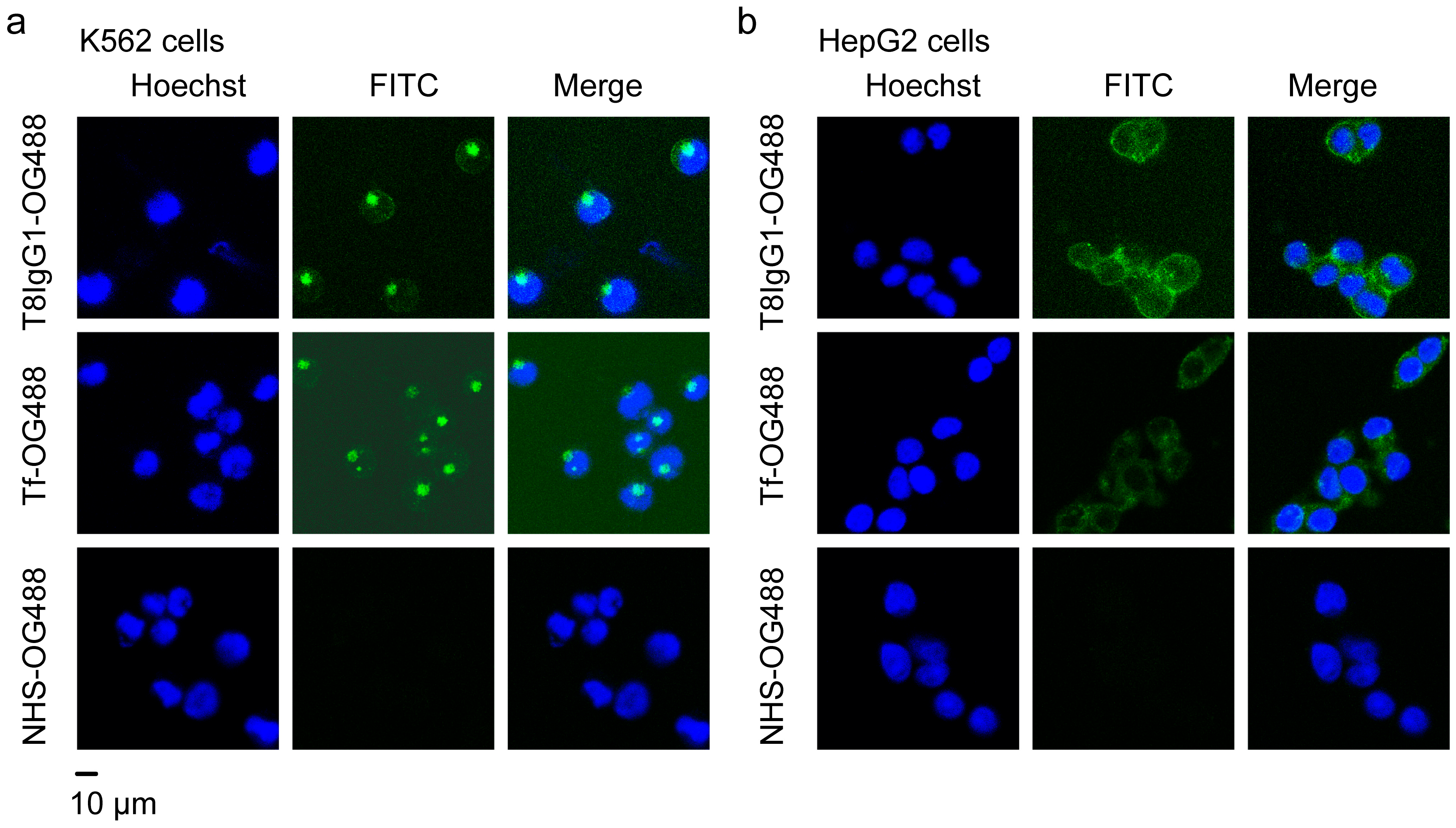 To assess antibody internalization, T8IgG1-OG488 was diluted in serum-free DMEM to a final concentration of 10 µg/mL and added to HepG2 cells cultured in 6-well plates until 70–80% confluence (~5 × 105 cells/well) or to K562 cells (~4 × 105 cells/well) in suspension culture. Cells were incubated at 37 °C with 5% CO2 for 2 h. After incubation, cells were gently washed three times with pre-chilled PBS to remove uninternalized antibody. Cells were then fixed with 4% paraformaldehyde for 10 min, washed three times with PBS, stained with Hoechst dye for 5 min, washed again, and mounted with mounting medium. Fluorescence images were captured using a fluorescence microscope. Two control groups included cells treated with equivalent amounts of Tf-OG488 or NHS-OG488.