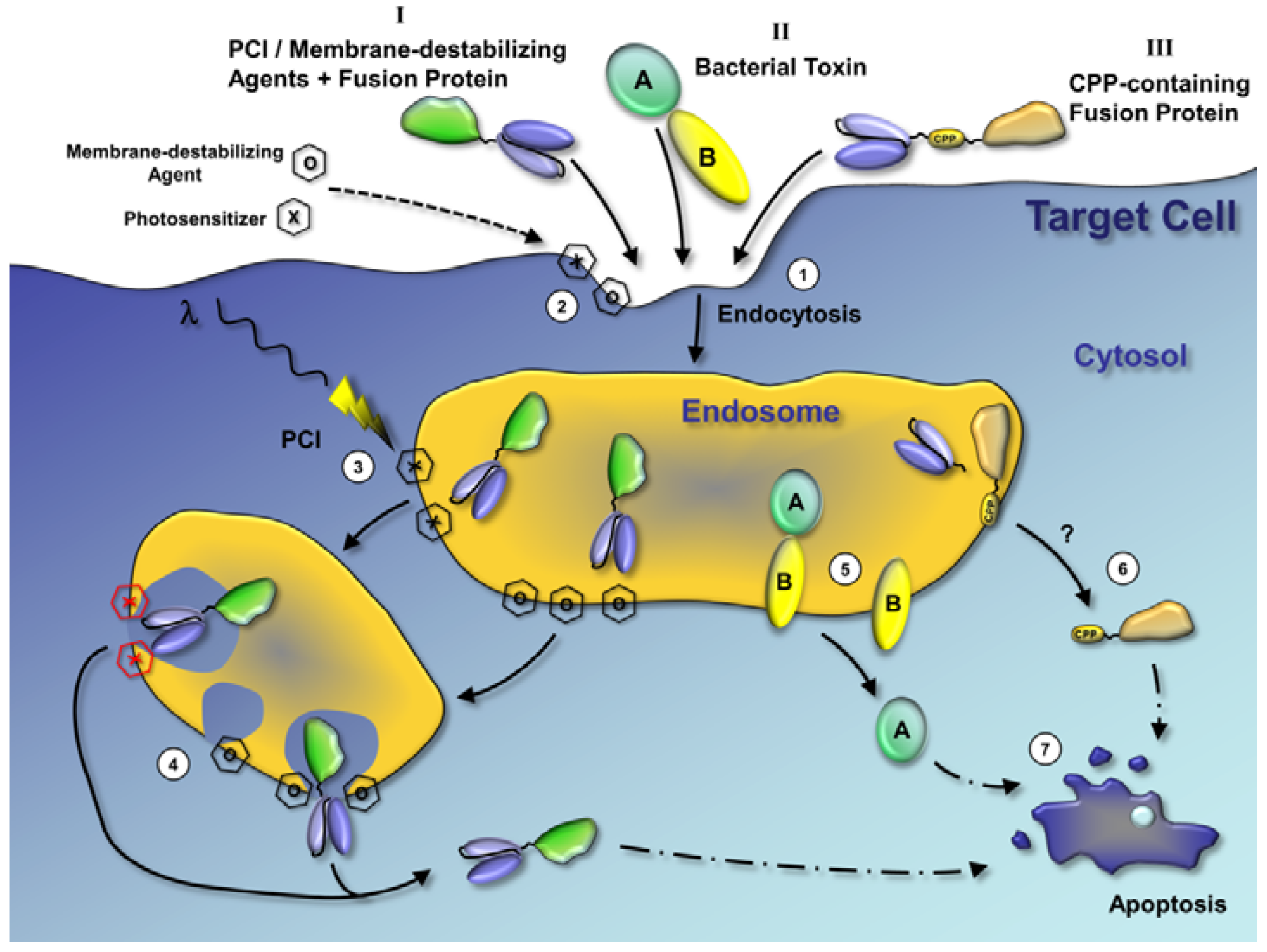 Mechanisms of endosomal escape. The three most relevant mechanisms of endosomal escape are depicted in this figure: Endosomal escape of drugs by photochemical internalization (PCI) or membrane-destabilizing agents (I), endosomal escape of bacterial toxins (II), and cell penetrating peptides (CPP)-mediated release of drugs from endosomes (III). Endosomal escape by PCI, membrane-destabilizing agents and CPPs has been described for a variety of drugs and the fusion proteins in this figure serve only as examples. (1) The first step for all three mechanisms is the binding of fusion proteins or bacterial toxins to specific cell surface receptors and the internalization into the target cell by endocytosis. (2) Endosomal escape of fusion proteins by PCI or membrane-destabilizing agents (I): Photosensitizers (hexagon marked with an X, required for PCI) and membrane-destabilizing agents (hexagon marked with an O) are co-administered with fusion proteins and internalize in the plasma membrane and co-internalize with the fusion proteins in endosomes. (3) The photosensitizers are activated by light (red hexagons marked with X) and induce reactive oxygen species production. (4) Both activated photosensitizers and high local concentrations of membrane-destabilizing agents result in endosomal leakage and rupture. The fusion protein is released to the cytosol. (5) Endosomal release of bacterial toxins (II): Bacterial toxins usually contain one protein or a protein domain (marked as B in the figure) that binds the cell surface receptor and initiates translocation of the catalytic protein or other protein domain (marked as A in the figure) through the endosomal membrane into the cytosol. (6) CPP-mediated endosomal release: CPPs mediate the translocation of conjugated drugs or proteins through the endosomal membrane. The detailed mechanisms are unknown and most likely vary for different CPPs. The cell-targeting domain of a fusion protein may be released before the CPP is active in the endosome. (7) All three described mechanisms result in the release of the fusion proteins in the cytosol. The active domains act on their intracellular targets and induce various effects, such as apoptosis, in the target cell.