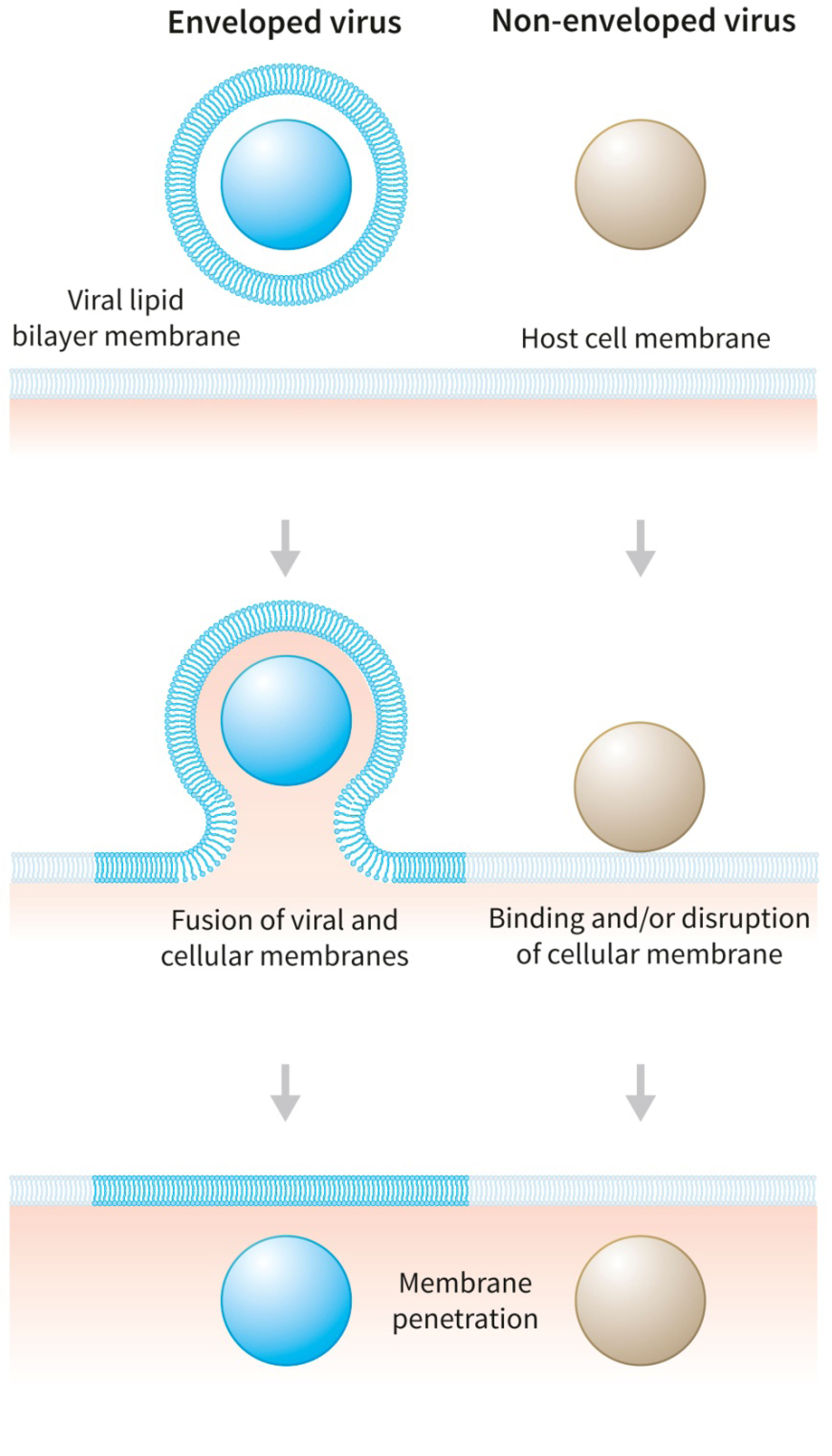 Viruses can be divided into two broad categories, enveloped and non-enveloped, each possessing a variety of different membrane disruptive machineries. A simple depiction of the differences in viral entry for the two categories of virus is shown in Figure 2.