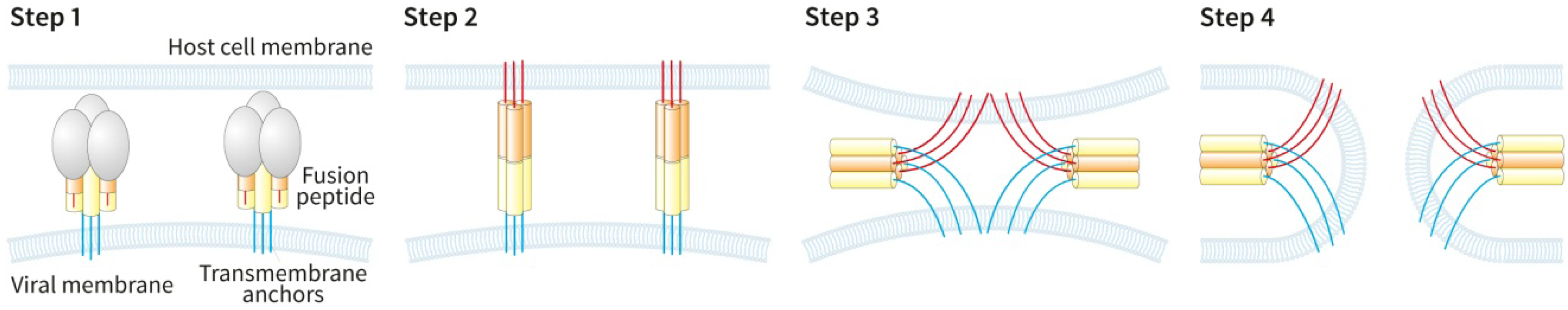 A model for membrane fusion by enveloped viruses by fusogenic viral proteins. Conformational changes in the fusogenic protein in the low pH endosomal compartment expose a fusogenic peptide which in Step 2 interacts with the host membrane followed by further structural rearrangements leading to the classical “hairpin” configuration as shown in Step 3. This brings the viral and host cell membranes into close proximity that results in their fusion shown in Step 4. Adapted and redrawn from Hughson (1997) [68].