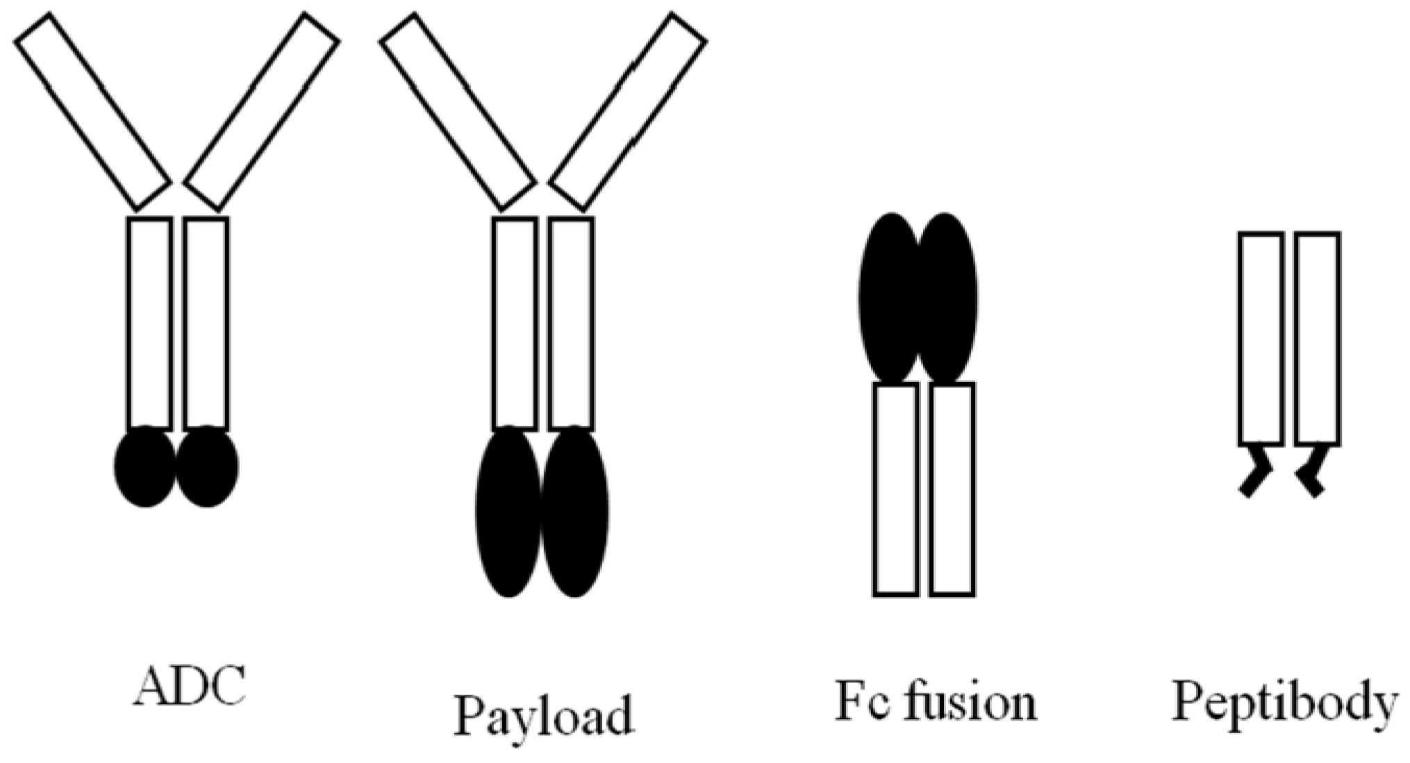 Fusion proteins are designed to possess multiple functions, i.e., site-specific delivery. The main difference between ADCs and fusion proteins is in the molecular structure. In ADCs, toxic agents are chemically conjugated to antibodies or their fragments, as depicted in Figure 1, while for fusion proteins, effector molecules (either protein or peptide) are inserted into the protein on the genetic level. Here, fusion proteins are grouped into three distinct classes depending on the mode of construct. First class (Figure 1) is composed of mAb (or fragments) and effector molecule. Fc-fusion proteins are composed of binding/functional peptides or proteins fused to the Fc-domain [12] (Figure 1). While antibody (or fragment) fusion proteins utilize specific antigen binding property of antibodies, Fc-fusions lack antigen-binding variable domains, and thus are not designed for targeted delivery. The Fc-domains are fused to either enhance the circulating half-life or confer ADCC or CDC function. Although no formal distinction exists, Fc-fusion proteins may be formally divided into Fc-protein fusion and Fc-peptide fusion.