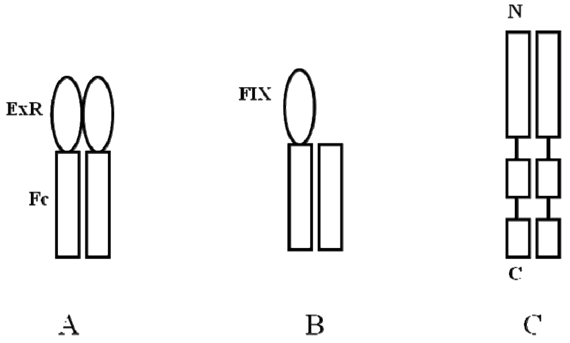 - Peters, R.T.; Low, S.C.; Kamphaus, G.D.; Dumont, J.A.; Amari, J.V.; Lu, Q.; Zarbis-Papastoitsis, G.; Reidy, T.J.; Merricks, E.P.; Nichols, T.C.; et al. Prolonged activity of factor IX as a monomeric Fc fusion protein. Blood 2010, 115, 2057–2064. [Google Scholar] [CrossRef]