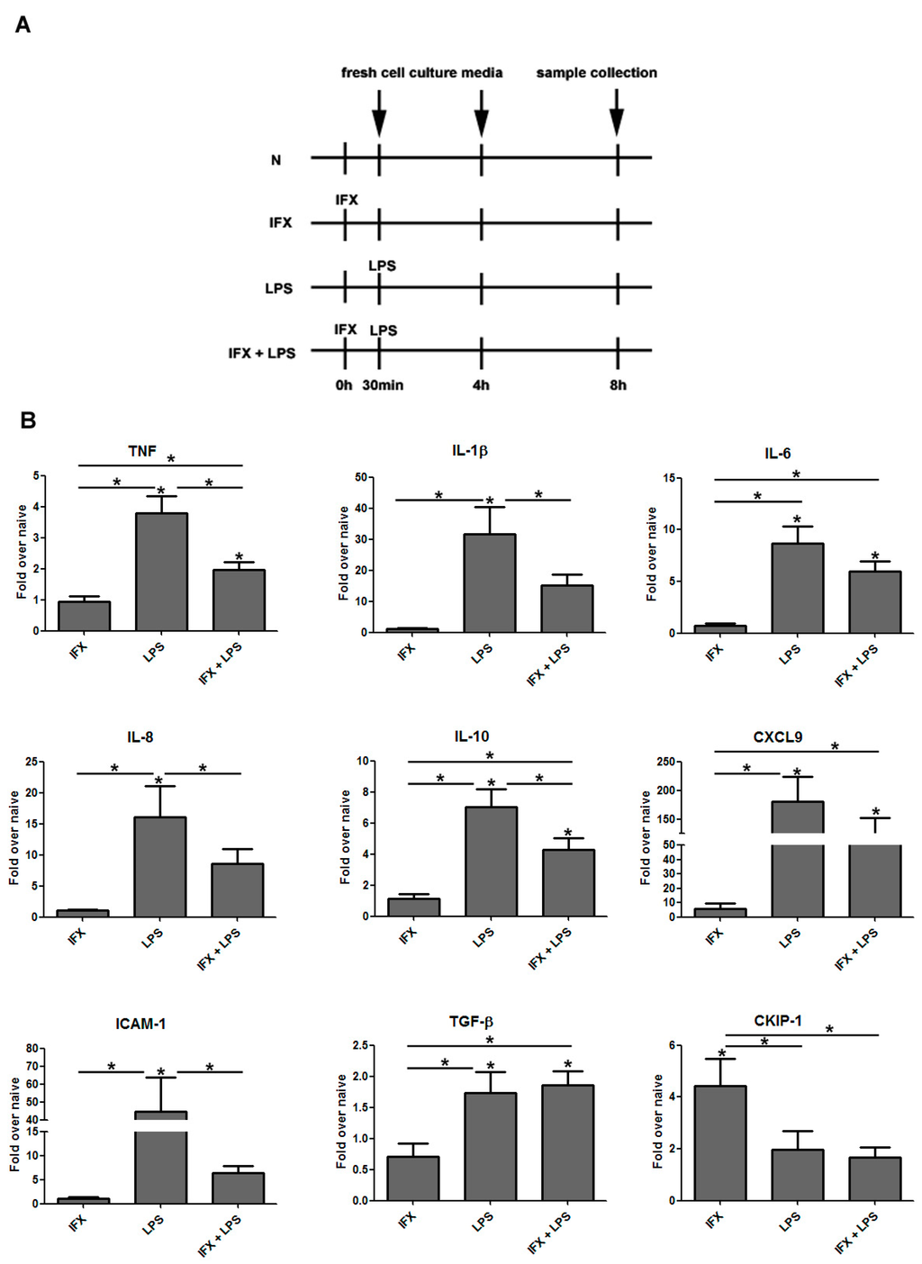 In previous reports, we and others [] have shown that reverse signaling influenced the transcription activity of different genes, and Mitoma and colleagues reported induction of apoptosis and cell cycle arrest in transmembrane TNF-expressing Jurkat T cells []. To investigate this phenomenon at relative gene expression level, THP-1 human monocytes were treated with IFX and/or LPS according to the model described at Figure 1A. In brief, cells were exposed to 10 µg/mL IFX and 30 min later IFX was removed and the cells were challenged with LPS in a concentration of 100 ng/mL or left untreated. After four hours the cells were washed with PBS and resuspended in fresh cell culture medium. Another four hours later, total RNA was extracted and QRT-PCR experiments were performed as described in the Materials and Methods section.