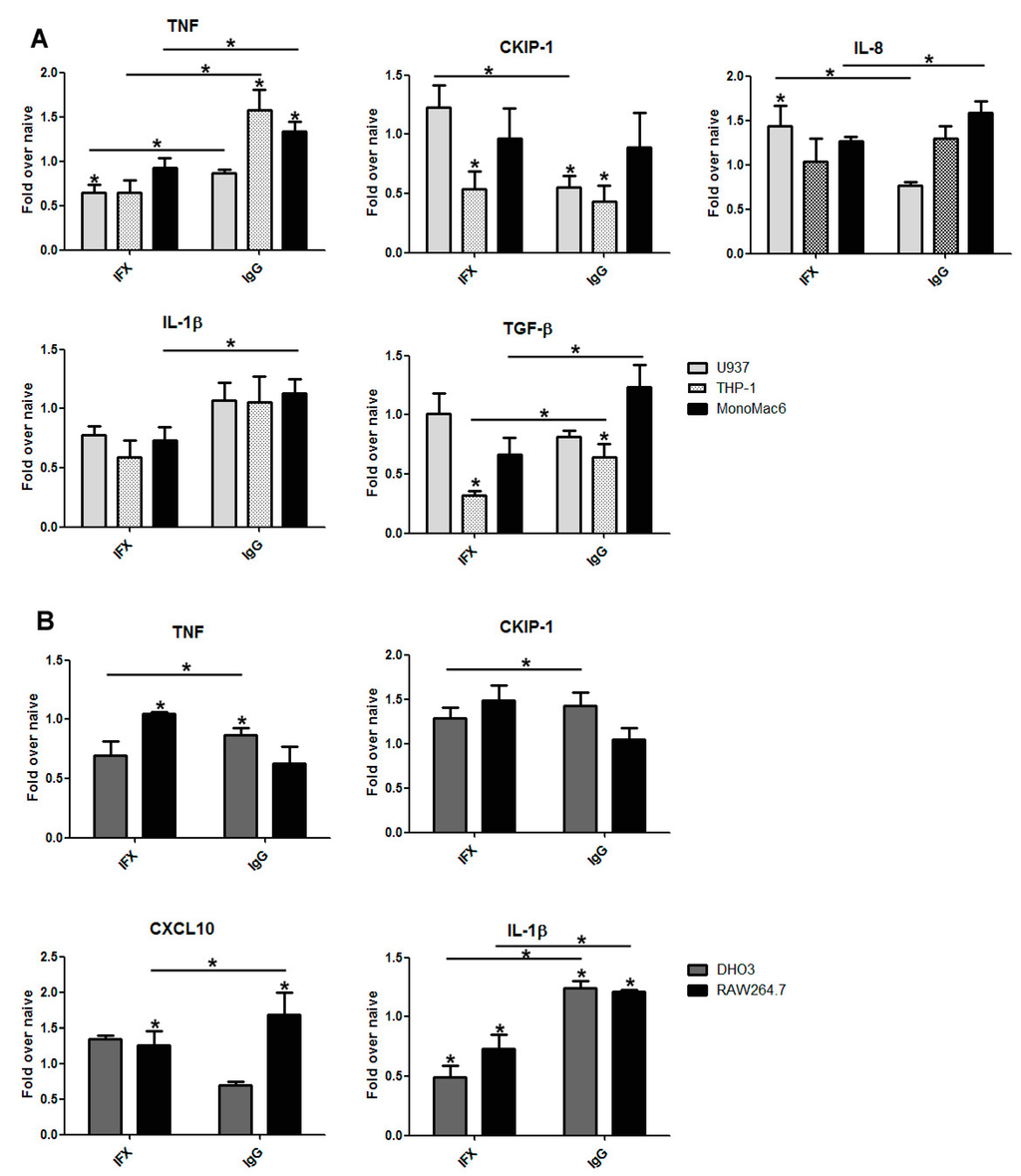 In order to test the role of the constant fragment of IFX on human (Figure 2A) and mouse monocyte and macrophage cell lines (Figure 2B), they were exposed to IFX or IgG1 for a day or left untreated. RNA isolation was performed 24 h later. In all human cell lines, IFX stimulation decreased the relative expression of TNF and IL-1β genes as compared with naïve and IgG treated samples. In the case of other genes, different cells responded in different ways to both IFX and IgG1, probably reflecting differences in the density and ratio of Fc receptors and TNF molecules on the cell surface.