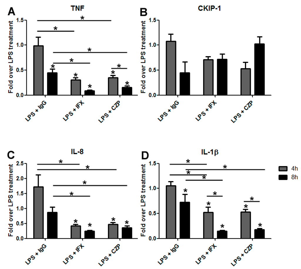 Induction of reverse signaling by distinct anti-TNF monoclonals modulates gene expression patterns in a time-dependent manner. Relative gene expression pattern of TNF (A), CKIP-1 (B), IL-8 (C), and IL-1β (D) were investigated by QRT-PCR on THP-1 human monocytes. To induce inflammatory response, LPS treatment was performed. Two hours post-LPS challenge, samples were stimulated with IgG1, IFX, or CZP, respectively. RNA was isolated from the cells four and eight hours after stimulation. IFX- and CZP-treated samples showed comparable effect on the gene expression of inflammatory cytokines, although CZP does not carry any Fc fragment. Data show average ± SEM from at least three independent experiments. * Significantly different from unstimulated controls (One-Way ANOVA following Neuman–Keuls post hoc test).