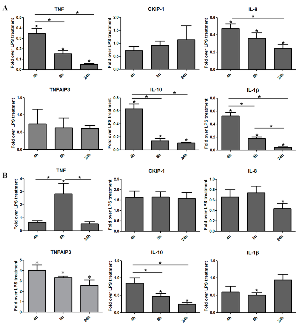 In THP-1 cells (Figure 4A), CZP treatment significantly decreased the relative gene expression of TNF, IL-8, IL-10, and IL-1β compared with untreated samples 4 h after anti-TNF treatment. An even more pronounced relative gene expression decline was detected at later time points, reaching the minimum level at 24 h after stimulation. In contrast to the above cytokines—and in accordance with our previous findings—the gene of CKIP-1 demonstrated an opposite pattern. Although at first a slight decrease was detected in relative gene expression (4 h after CZP treatment), at subsequent time points a minor upregulation of relative gene expression was demonstrated, as compared with the 4 h samples or untreated control, though the increase was not significant.