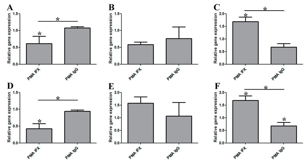 IFX (and IgG) treatment of PMA-induced primary mouse macrophages. Primary mouse macrophages were activated by PMA and IFX or IgG stimulation was performed. PMA-stimulated cells were used as control. The relative gene expression pattern of TNF (A), IL-1β (B), PDCD1 (C), CXCL9 (D), CXCL10 (E), and ICAM1 (F) were determined by qRT-PCR 24 h after the induction of reverse signaling. Bars show means ± SEM from at least three independent experiments. * Significantly different (One-Way ANOVA, following Neuman–Keuls post hoc test).