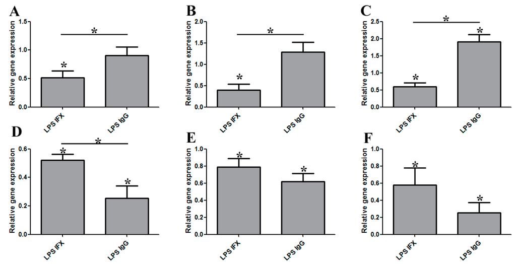 The effect of IFX on LPS-challenged primary mouse macrophages. Macrophages were activated by the presence of LPS before IFX treatment. Relative gene expression of TNF (A), IL-6 (B), PDCD1 (C), CXCL9 (D), CXCL10 (E), and ICAM-1 (F) was determined by qRT-PCR. LPS- and IgG-treated, as well as only LPS-stimulated, samples were used as controls. Bars show average ± SEM from at least three independent experiments. * Significantly different (One-Way ANOVA, Neuman–Keuls post hoc test).