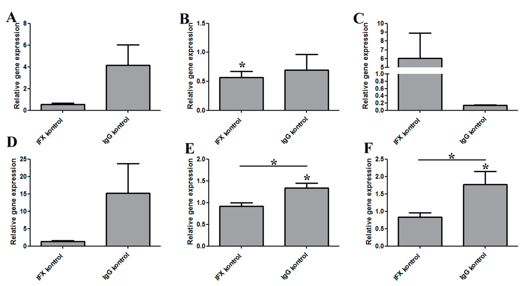 In mouse macrophage cells moderate downregulation of relative gene expression of IL-1β was measured 24 h after IFX treatment. In the cases of TNF, CKIP-1, and CXCL10, as in human cell lines, no gene- or treatment-specific tendencies were observed. However, in practically all cases the effect of IFX on a certain cell line was dissimilar from the effect of IgG1 on the same cells. We might conclude that the effect of infliximab could be influenced by, but does not depend on, its Fc fragment.