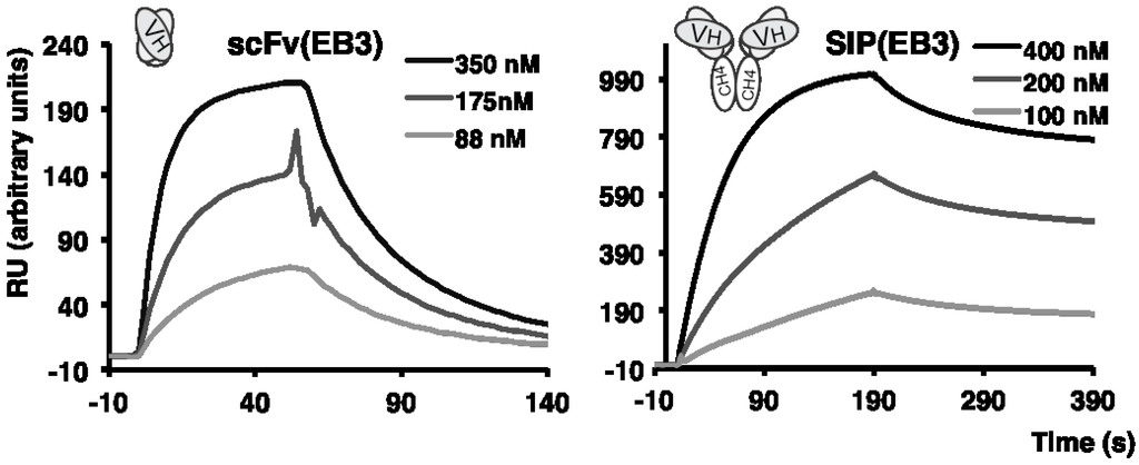 The EB3 antibody was reformatted as a small immune protein (SIP) [45]. A monomeric preparation of scFv(EB3), as well as the same antibody in SIP format, were studied using BIAcore technology on a microsensor chip coated with the DLK1-Fc fusion protein (Figure 2, Supplementary Figure S2). The binding parameters for scFv(EB3) were Kon = 2.7 × 105 Ms−1, Koff = 2.7 × 10−2s−1 and Kd = 99 nM. SIP(EB3) exhibited a higher functional affinity and a reduced kinetic dissociation constant, as a result of avidity effects.