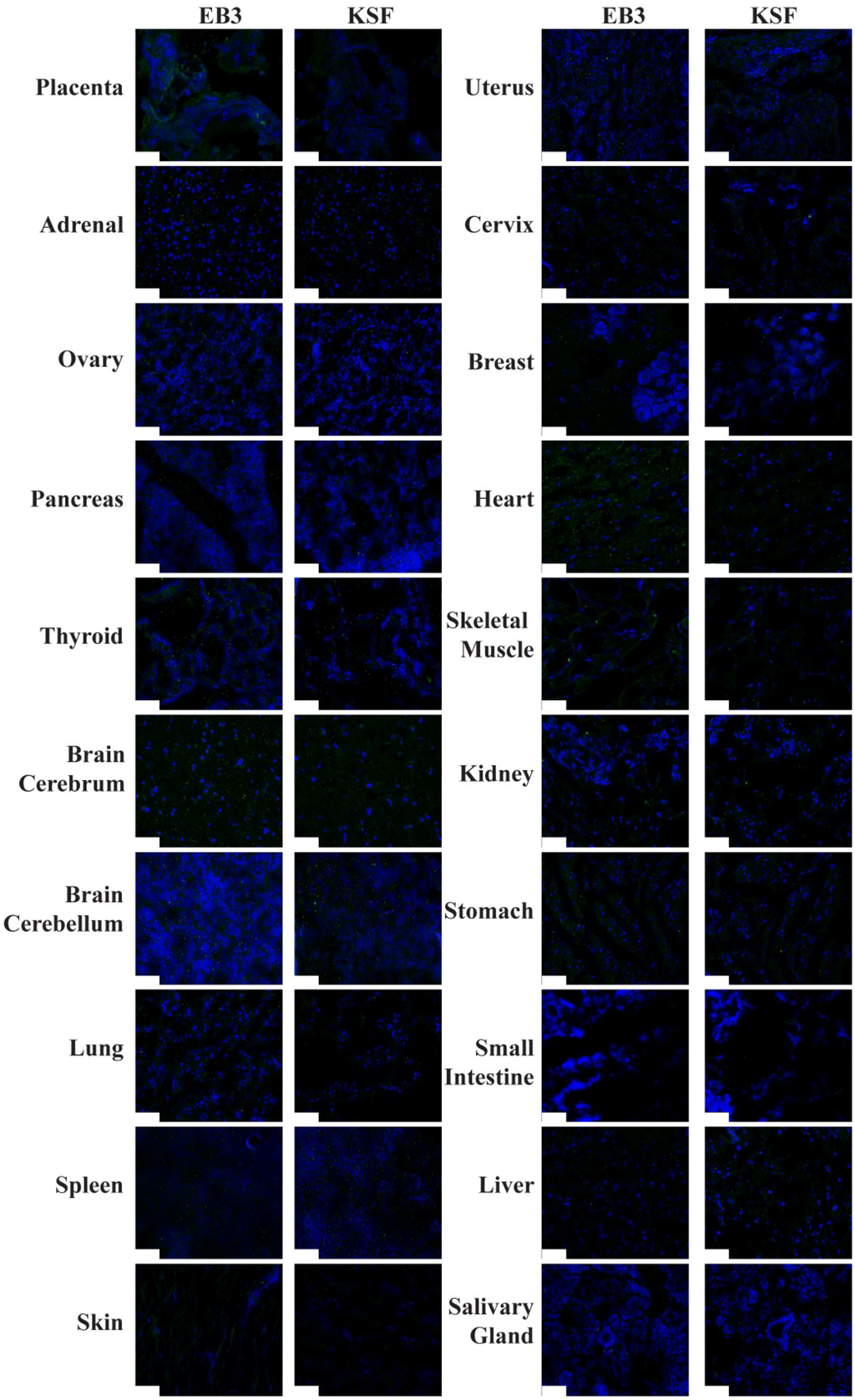 Immunofluorescence staining of human healthy tissues using small immune protein antibody formats SIP(KSF) and SIP(EB3). SIP antibodies are shown in green as they were detected using anti-human-IgE IgG antibody, which was further detected by Alexa Fluor 488 goat anti-rabbit IgG antibody. Cellular nuclei were stained with DAPI.