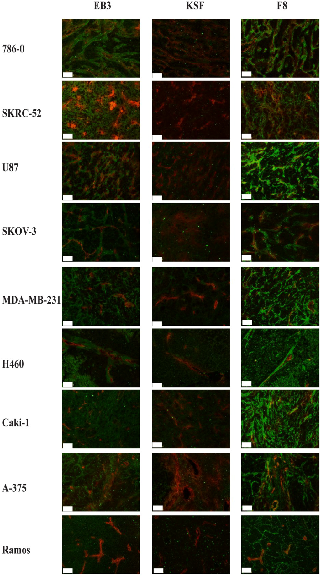 Freshly frozen human tumors xenografted in nude mice were stained with the SIP(EB3) antibody (green) and with an anti-CD31 reagent, which recognizes vascular structures (red). Immunofluorescence microscopic analysis revealed that 8/9 tumors were strongly stained for DLK1 expression (786-0, SKRC-52, U87, SKOV-3, MDA-MB-231, H460, Caki1 and A-375), while Ramos lymphoma exhibited only a weak staining. SIP(F8), a clinical-stage antibody specific to the alternatively-spliced EDA domain of fibronectin, was used as a positive control. The F8 antibody exhibited a strong staining in 9/9 tumor xenografts, as expected based on previous reports of our group [39] (Figure 4). In addition, SIP(KSF), an antibody specific to hen-egg lysozyme and thus serving as negative control, did not exhibit any detectable staining in both healthy and tumor sections [46] (Figure 3 and Figure 4).