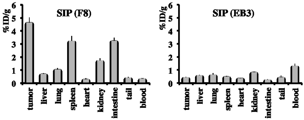 Radioiodinated preparations of SIP(F8) (left) and SIP(EB3) (right) were injected into nude mice, bearing subcutaneously-grafted U87 tumors. Twenty-four hours after intravenous administration, SIP(EB3) failed to localize to the neoplastic lesions in vivo. Results are expressed as percentage of injected dose per gram of tumor tissue (%ID/g).