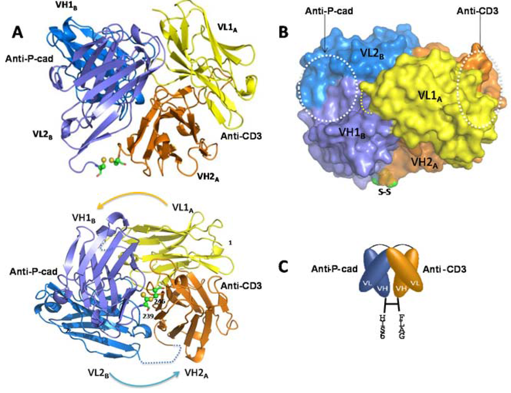 (A) Views from side (top) and above (bottom) of the crystal structure of DART 35 illustrate the tightly packed diabody formation. The structure shows that the disulfide bond (green) is formed between the two chains, keeping the diabody in a compact configuration; (B) Antigen binding sites for the anti-CD3 CDR region (right white dot circle) and the anti-P-cadherin CDR region (left white dot circle) of DART 35 are highlighted in the space-filled illustration. Yellow dot circle represents the interface region. The binding sites for the two antigens are located on opposite sides of the diabody; (C) Schematic representation of the DART 35 used for crystallography studies. Pcad = P-cadherin; VH = Heavy chain variable region; VL = Light chain variable region; S–S = Disulfide bond.