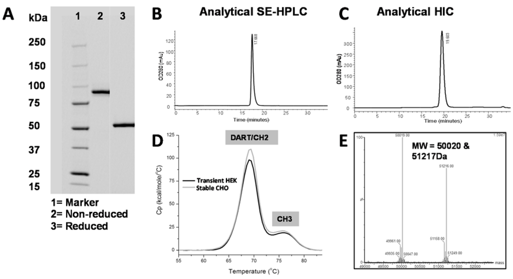 Biophysical properties of purified anti-P-cadherin LP-DART #153 (PF-06671008) (A) SDS-PAGE analysis under non-reducing and reducing conditions; (B) Size exclusion chromatography (SCE) of PF-06671008 on Superdex200 10/30GL column; (C) Analytical hydrophobic interaction chromatography (HIC) (D) Differential scanning calorimetry (DSC) analysis of transiently and stably expressed PF-06671008 exhibits thermal profiles with Tm1 transitions ≥ 68 °C; (E) Liquid chromatography/ mass spectrometry (LC/MS) of PF-06671008: reduced/alkylated and PNGaseF treated PF-06671008 shows two peaks at 50019 and 51216, corresponding well with the predicted molecular weight (MW) of the two chains 50020 and 51217 respectively.