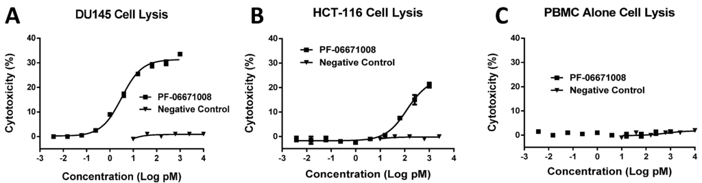 Dose-response curves of PF-06671008 or control DART (4420-LP)-mediated cytotoxicity measured using the lactate dehydrogenase (LDH) assay with primary human peripheral blood mononuclear cells (PBMCs) as effector cells and (A) DU145, or (B) HCT-116-Luc cell lines, respectively, as target cells at an effector:tumor (E:T) cell ratio of 30:1; (C) Dose-response curves of PF-06671008 or control DART (4420-LP)-mediated cytotoxicity measured using the LDH assay with primary human PBMCs alone.