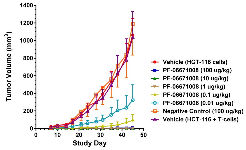 PF-06671008 demonstrated potent in vivo tumor growth inhibition in a colorectal carcinoma tumor model. Treatment with PF-06671008 administered as a single agent IV once daily for four doses resulted in a dose-dependent inhibition of tumor growth when HCT-116 adenocarcinoma tumor cells were implanted SC in the presence of activated human T cells. Inhibition of tumor growth was observed at PF-06671008 doses ≥ 0.01 µg/kg, while no tumor growth was observed in mice treated with doses ≥ 1 µg/kg.