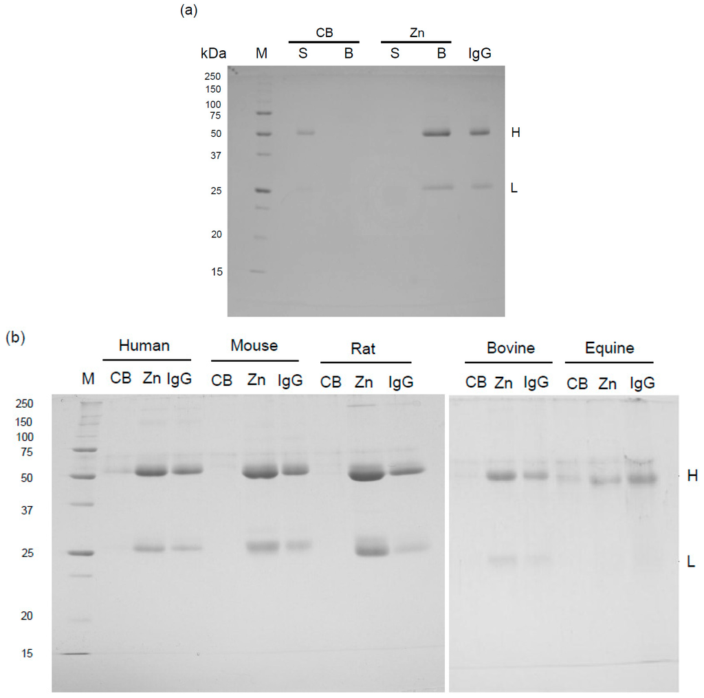 Binding of human and animal IgGs to Zn-beads. (a) Aliquots (1 mL) of IgG (25 µg) and Zn-beads (Zn) or CB in phosphate-buffered saline (PBS) were prepared (net volume of beads per sample: 20 µL each) and incubated at 4 °C overnight. The mixture was centrifuged at 14,000× g for 7 min and the supernatant (S) and pelleted beads (B) were analyzed by sodium dodecyl sulfate-polyacrylamide gel electrophoresis (SDS-PAGE) as described in the “Experimental Section”. Human IgG (IgG) was also applied to the gel (2 µg/lane) and the separated H and L subunits are denoted H and L, respectively. M represents marker proteins; (b) Animal IgG samples were treated as described in (a), and only the resultant beads were analyzed by SDS-PAGE. The H and L subunits from the various animal IgGs (2 µg each per lane) were denoted H and L. M represents marker proteins.