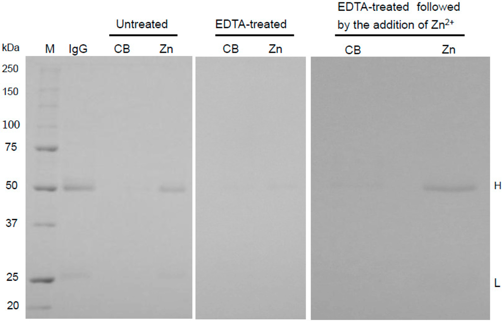 Effect of ethylenediaminetetraacetic acid (EDTA) on the binding of human IgG to Zn-beads. Zn-beads and CB were treated with or without 50 mM EDTA (pH 7.4). After washing, PBS (980 µL) containing human IgG (25 µg) was added to aliquots of the treated and untreated Zn-beads and CB (net volume of beads per sample: 20 µL). Different aliquots of EDTA-treated CB and Zn-beads were washed and incubated with 1 mL 50 mM ZnSO4, rotated overnight, and then the ZnSO4-treated beads were washed and suspended at 50% (v/v) in PBS. Aliquots (1 mL) of IgG (25 µg) and ZnSO4-treated beads (Zn-beads or CB) in PBS were prepared (net volume of beads per sample: 20 µL each), and incubated at 4 °C overnight. As described in the “Experimental Section”, the obtained bead sample was analyzed by SDS-PAGE; human IgG (IgG) was also applied to the gel (2 µg/lane), and the separated H and L subunits were denoted H and L, respectively. M represents marker proteins.