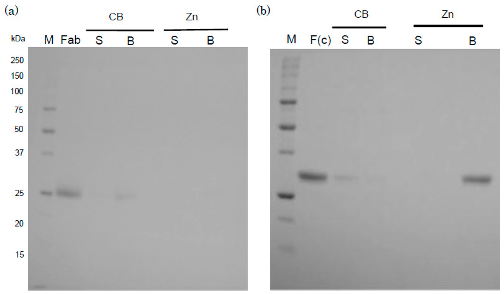 The binding of human IgG Fab (a) and F(c) fragments (b) to Zn-beads. Aliquots (1 mL) of each fragment (25 µg) and Zn-beads or CB in PBS were prepared (net volume of beads per sample: 20 µL each), and incubated at 4 °C overnight. The mixtures were centrifuged at 14,000× g for 7 min, and the supernatant and pelleted beads were subjected to SDS-PAGE as described in the “Experimental Section”. Supernatant (S) and pelleted beads (B) from respective CB and Zn-beads (Zn) incubated with Fab (a) and F(c) (b) were applied to SDS-PSGE. Human IgG Fab and F(c) fragment samples were also applied to the gel (2 µg each/lane). M represents marker proteins.