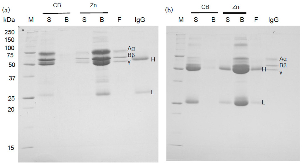 One mL PBS containing human fibrinogen (600 µg) or IgG (500 µg) and a suspension of 40 µL 50% (v/v) Zn-beads or CB beads was prepared (net volume of beads per sample: 20 µL) and the mixture was rotated at 4 °C overnight. The presence of human fibrinogen or IgG was detected in the supernatant, suggesting that the Zn-beads were saturated with fibrinogen or IgG (data not shown). A 20 microliter aliquot of human IgG (100 µg) and fibrinogen (100 µg) in PBS were added to a suspension of beads saturated with fibrinogen and IgG, respectively, and further incubated as described above. The mixture was centrifuged at 14,000× g for 7 min at 4 °C to provide supernatant and pelleted beads for SDS-PAGE. Pelleted beads were applied to gel as much as possible due to natural sedimentation. CB were treated and analyzed in an identical manner.