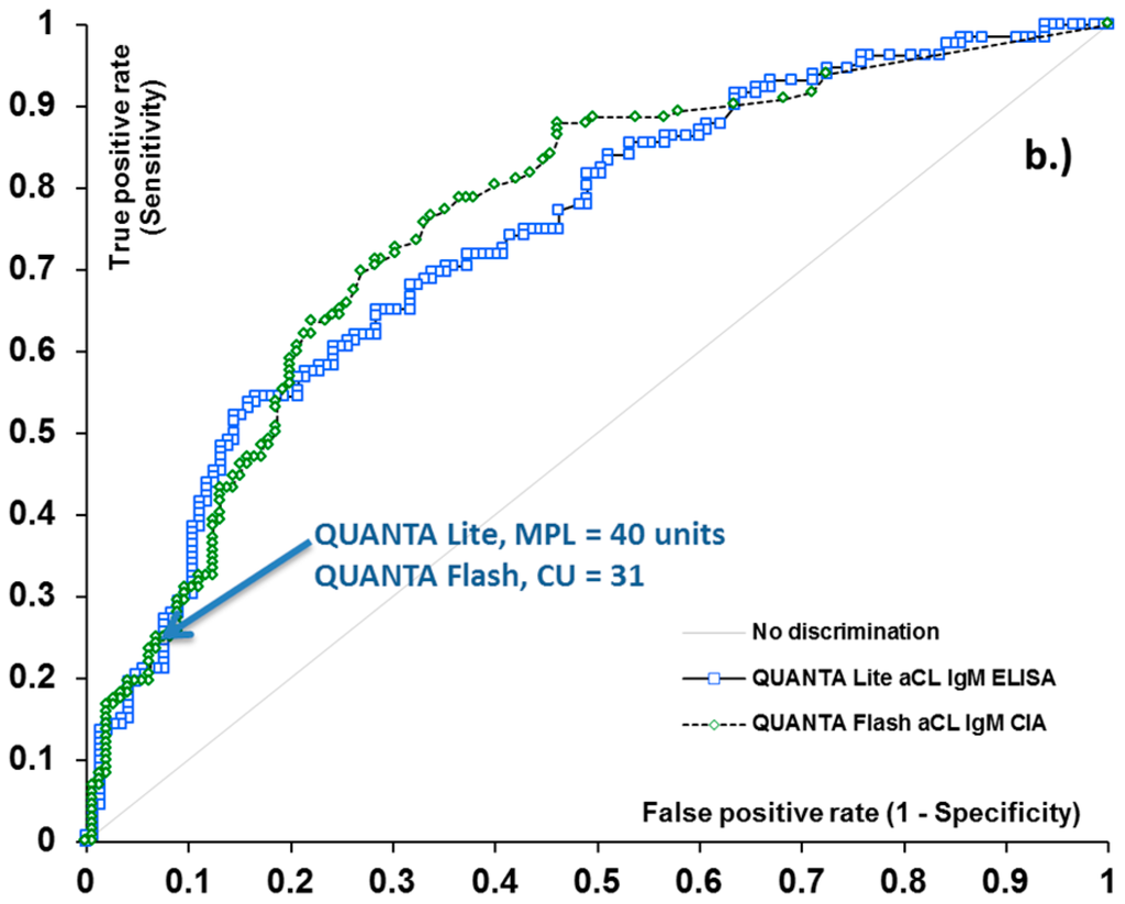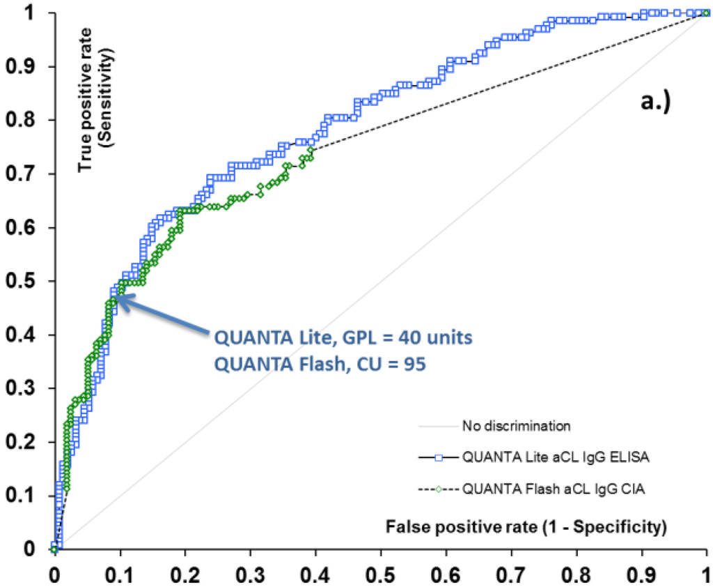 We verified the clinical relevance of the 40 GPL and MPL unit threshold for the QUANTA Lite aCL assays, and determined that, at this level, the ELISAs were are able to distinguish APS patients from non-APS patients with acceptable clinical sensitivity (48.1% and 25.0%) and specificity (91% and 92.4%). Based on this performance goal, we utilized ROC analysis to identify 95 CU for IgG and 31 CU for IgM aCL antibodies as thresholds for QUANTA Flash assays providing equivalent clinical performance as that of the ELISAs at 40 GPL and MPL units. These values are, therefore, considered as the low/medium threshold for aCL antibodies measured with QUANTA Flash tests.