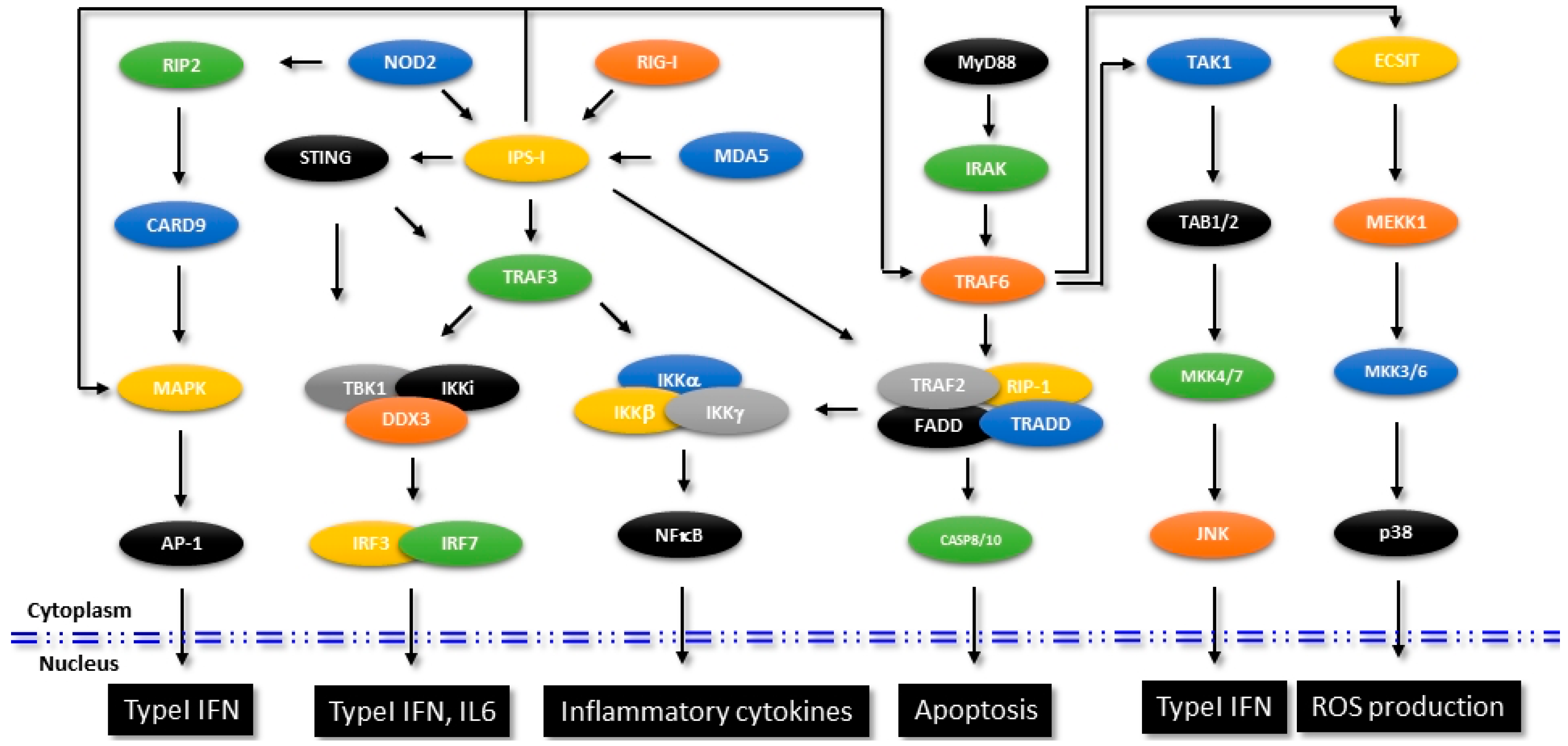 Figure 2. Signaling mechanisms in innate immunity. Figure shows the identified signaling mechanisms that are involved in the regulation of innate immune pathways. Specific molecules that intersect other pathways affecting intracellular functions are shown.