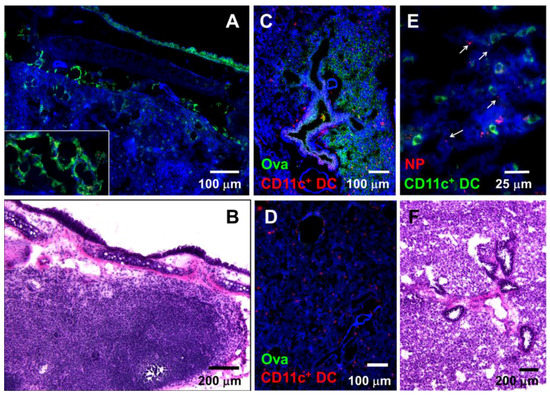 Nasally applied soluble antigens and nanoparticles (NPs) reach the mediastinal lymph nodes (LNs) and lung tissue in anesthetized mice shortly after administration. (A) Dextran (green) and 20 nm NPs (red) in lymph ducts of the mediastinal LNs 1 h after i.n. administration. Inset: larger magnification image showing 20 nm NPs colocalizing with dextran in lymph ducts of the mediastinal LNs. (B) Hematoxylin and eosin (H&E)-stained mediastinal lymph node. (C) Ova (green) within the lung tissue 1 h after i.n. Ova administration; CD11c+ DCs are shown in red. (D) Control lung tissue stained with antibodies against Ova and CD11c DC; (E) Large magnification image of lung tissue section showing 20 nm NPs (red, arrows) and CD11c+ DCs (green). (F) H&E-stained lung tissue section depicting lung tissue anatomy. (A, C, D, E) Tissue architecture was highlighted with actin-binding phalloidin-Alexa 350 (blue).