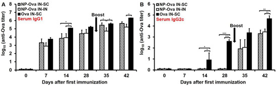 3.2. Nasal Administration of Soluble Ova Induces Serum IgG1/IgG2c Antibodies, While Administration of NP-Ova Prompts an IgG1-Dominated Response Prior to Boost