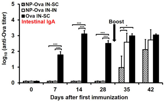Intestinal IgA titers in mice primed i.n. with soluble Ova or NP-Ova and boosted via intranasal (i.n.) or subcutaneous (s.c.) administration with NP-Ova or Ova+CFA, respectively. Mice were i.n. immunized with NP-Ova and boosted i.n. with NP-Ova or s.c. with Ova+CFA at day 28 (arrow). Another group of mice were i.n. immunized with 20 mg soluble Ova and s.c. boosted with Ova+CFA at day 28 (arrow). Ova-specific secretory IgA (sIgA) antibody titers of fecal extracts are expressed as log10 titer values, with the titer being the highest dilution showing an absorbance value twice that of the negative control. Data collected from 10 mice per group (2 separate experiments) are expressed as the mean ± SD of the mean and were declared significantly different at p < 0.05 (*), p < 0.01 (**) and p < 0.001 (***).