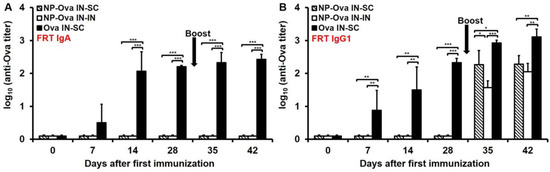 For these studies six- to eight-week-old female C57BL/6 mice (Jackson Laboratories) were used. Mice were immunized with 20 nm polystyrene NPs (Invitrogen) conjugated to Ova (Sigma, St. Louis, MO, USA) as described previously [35,38]. The amount of Ova conjugated to NPs was determined using a BCA protein assay (Pierce, Rockford, IL, USA). Mouse-specific IgG1, IgG2c, and IgA antibodies, conjugated to alkaline phosphatase (AP) (Southern Biotechnology Associates, Inc., Birmingham, AL, USA) were used to determine antibody titers in sera and mucosal secretions of immunized mice.