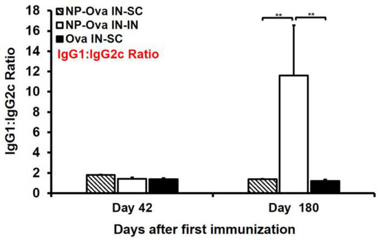Examination of serum IgG1 and IgG2c titers at day 28 after priming show that only mice i.n. immunized with soluble Ova exhibited a mixed Th1/Th2 response with substantial IgG1 and IgG2c titers (Figure 2A,B). Mice primed nasally with NP-Ova, on the other hand, exhibited an IgG1-dominanted serum response prior to the boosting immunization at day 28. By day 42, the IgG1:IgG2c ratios of all mice were similar (Figure 5), with no significant differences among groups, indicating that all prime-boost strategies we employed were comparable in inducing a mixed Th1/Th2 response. However, at 180 days following priming immunization, the IgG1:IgG2c ratios increased significantly only in i.n.-boosted mice due to the significant decline in serum IgG2c titers, again indicating that priming and boosting mucosally does not ensure longevity of humoral immune memory (Figure 5 and Table 1).