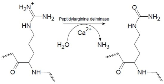 - Gyorgy, B.; Toth, E.; Tarcsa, E.; Falus, A.; Buzas, E.I. Citrullination: A posttranslational modification in health and disease. Int. J. Biochem. Cell Biol. 2006, 38, 1662–1677. [Google Scholar] [CrossRef] [PubMed]
