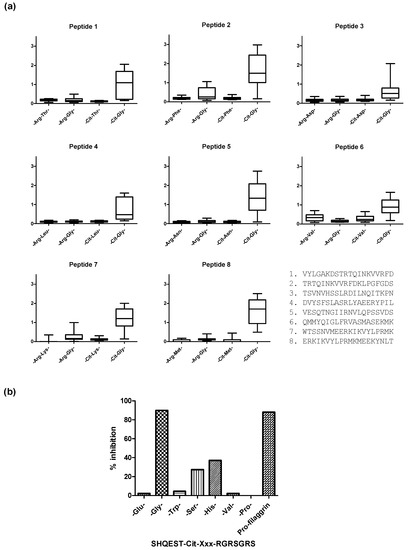 Original findings analyzing ACPA reactivity described that citrullinated epitopes primarily depend on a combination of Cit with small neutral amino acid residues such as Ser or Gly, often in combination with Val, His or Thr [2,3,128,132,133,134]. Recent findings do, however, indicate that primarily the -Cit-Gly- motif is essential for antibody reactivity, as illustrated in Figure 2. Using 20-mer ovalbumin peptides containing Arg-Xxx residues in the center, the following substitutions of -Arg-Gly-, Cit-Xxx-, and -Cit-Gly- were introduced to examine the effect of the Cit-Gly motif. As seen in Figure 2a, only the peptides containing the Cit-Gly motif obtained significant antibody reactivity [131]. These findings were confirmed by Ala scanning studies, where antibody reactivity to substituted pro-filaggrin peptides was analyzed. Using a 14-mer citrullinated pro-filaggrin peptide as a template, we found that all amino acids could be substituted with Ala without reducing antibody reactivity, except from the central Cit-Gly motif [133,135]. Moreover, we found that antibody reactivity was significantly reduced when substituting Gly in the Cit-Gly motif with other amino acid residues such as Ser, Thr, His, Pro, Trp and Val, as illustrated in Figure 2b [131]. Furthermore, it has been reported that the N-terminal position next to Cit and the second and third position C-terminal to Cit are irrelevant for antibody reactivity, as several amino acids are tolerated in these positions [131]. In addition to a Cit-Gly motif, the presence of positively charged amino acids C-terminal to Cit does appear to stimulate interaction, as peptides containing a Cit-Gly motif in combination with a positively charged residue in the C-terminal yield higher sensitivities [44,84,135,136]. Thorough characterization of a Fab-collagen peptide complex (A-Cit-GLTGRPGDA) performed by Uysal and colleagues confirmed that Cit and a C-terminal Arg are essential for reactivity, as the side chains of these residues are involved in most of the interactions with the antibody [44].