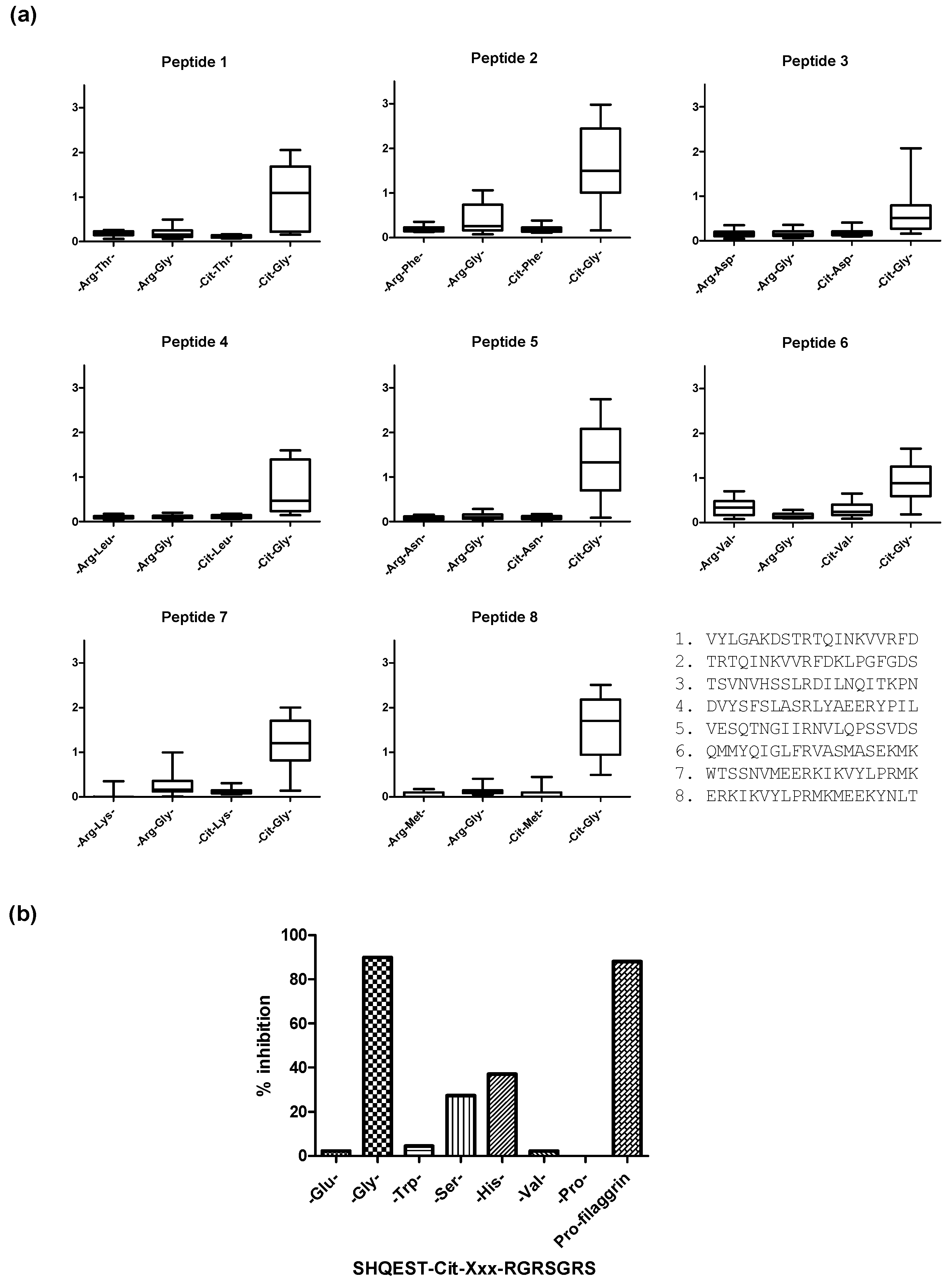 Anti-citrullinated protein antibody reactivity to substituted citrullinated peptides. (a) ACPA reactivity to substituted 20-mer ovalbumin peptides. Original peptides containing Arg in a central position were used as templates. In the remaining peptides, the Arg-Xxx motif was substituted with Arg-Gly, Cit-Xxx and Cit-Gly; (b) ACPA reactivity to substituted pro-filaggrin peptides. The peptide SHQEST-Cit-GRSRGRS was used as template. In the position C-terminal to Cit, various amino acid residues were introduced (Glu, Gly, Trp, Ser, His, Val, Pro). The 22-mer pro-filaggrin peptide (HQSHQEST-Cit-GRSRGRSGRSGS) was used as control.