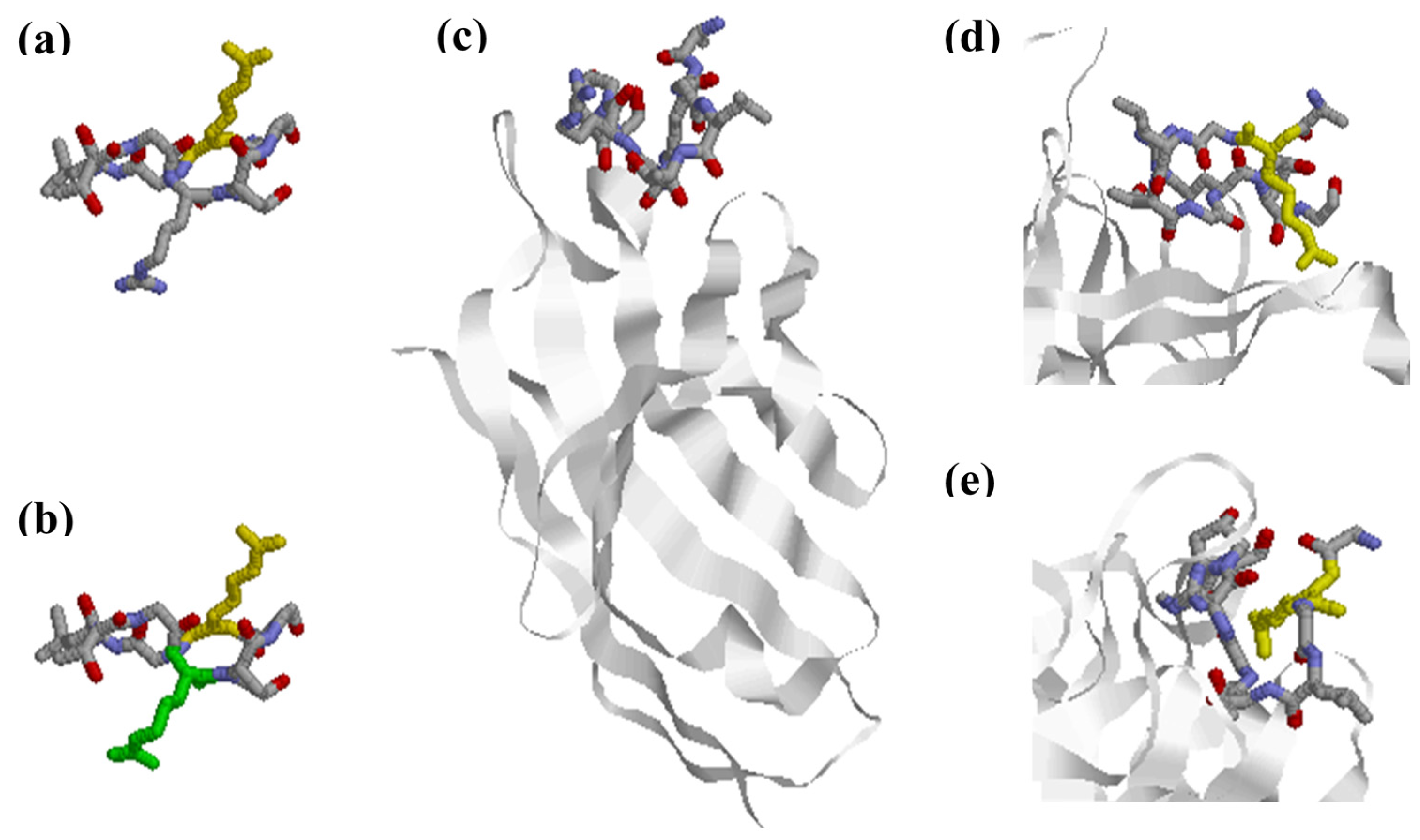 Anti-citrullinated collagen type II antibody in complex with citrullinated collagen II peptide aa 359–369. (a) Location of Cit (yellow) in the selected epitope; (b) Location of Cit (yellow) and Arg (green) extending in opposite directions; (c) Location of the citrullinated epitope in relation to the antigen-binding site of the antibody; (d) Location of Cit in the collagen II peptide relative to the antibody-binding groove; (e) Orientation of Cit into the antibody-binding groove. PDB ID: 2W65 [44].
