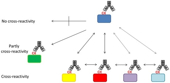 The principle of ACPA reactivity is depicted in Figure 4. As seen, ACPAs have been reported to recognize a diverse set of citrullinated proteins [112,143,144]. However, a small group of ACPAs appear to be less cross-reactive or even epitope-specific; thus, they only recognize a single citrullinated epitope [79,143,144]. This makes ACPAs a collection of (partially) cross-reactive antibodies.