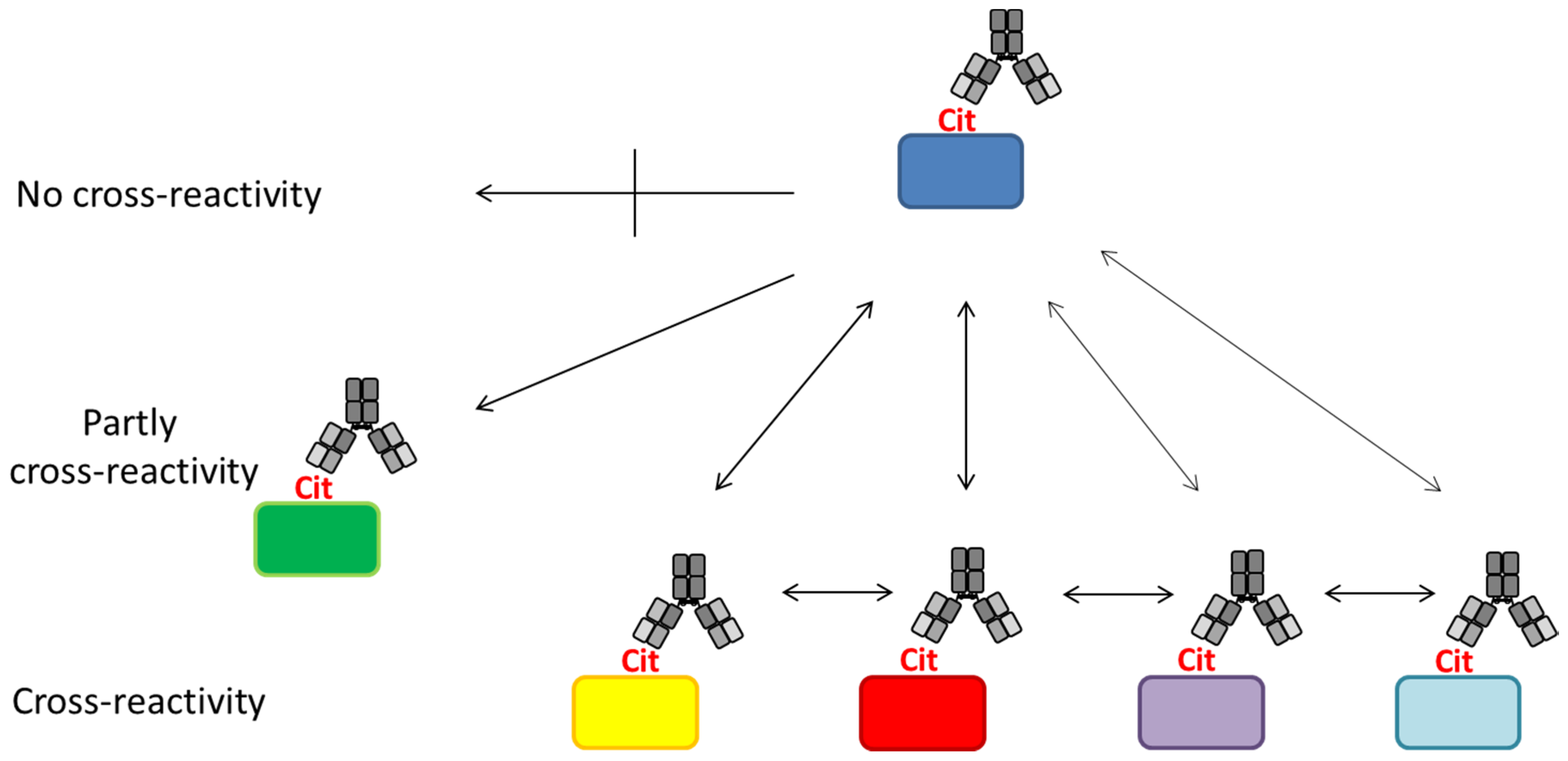 Anti-citrullinated protein antibodies are a collection of partially cross-reactive antibodies recognizing citrullinated targets. ACPA reactivities can be divided into several (partially) cross-reactive fine specificities. Some ACPAs captured by a citrullinated protein cross-react with other citrullinated proteins. A small group of ACPAs appears to have limited or no cross-reactivities. Different colors indicate different proteins.