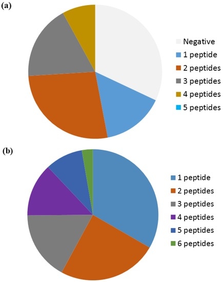 Reactivity of rheumatoid arthritis sera to linear citrullinated peptides. (a) Reactivity of 60 RA sera to five selected EBNA-1 peptides [136]; (b) Reactivity of 141 RA sera to six citrullinated peptides (vim60−75, α-enolase15−21, fibrin617−31, col-II358−75, filaggrin306−24, PAS621−40) [113].