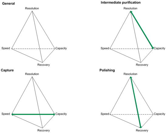 Optimizations in the USP concepts have led to increasing product titers. Along with this, raised impurity profiles have been observed [8,9]. Various compositions of the cultivation broth present challenges in the DSP of biotechnologically produced proteins. Considering the generic platform production process for antibodies, unit operations like centrifugation, micro- and ultrafiltration, protein A affinity chromatography, two orthogonal virus inactivation steps, ion-exchange (IEX), and hydrophobic interaction chromatography (HIC) are being used [5]. For the characterization of protein purification stages, key performance parameters can be used. These are typically resolution, speed, recovery, and capacity, as seen in Figure 1.