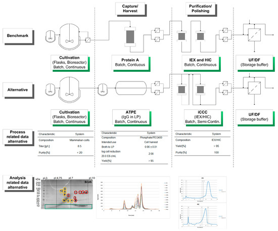 The considered process for the production of monoclonal antibodies utilizes mammalian cell cultivations. Afterwards, the aqueous two-phase extraction (ATPE) is used as a cell harvesting or capture step, depending on the system composition used [41,42,43,44,45]. Following the ATPE, the integrated counter current chromatography (iCCC), which is a combination of an IEX and HIC, is employed as a purification and polishing step. This combination of chromatographic columns leads to a highly purified product [46].